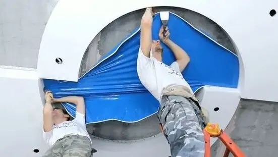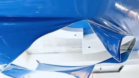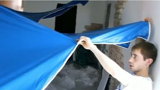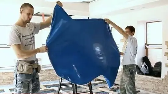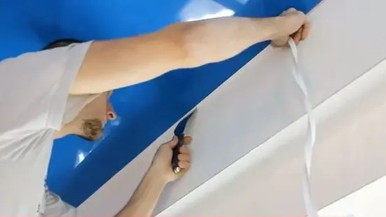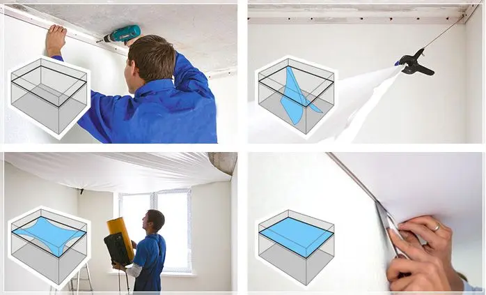 Далее необходимо подвесить специальную плёнку и разместить её на клипсах. Нагревая потолок, эта плёнка становится мягкой и её можно растянуть по всем углам. После того как потолок остынет, плёнка будет выглядеть идеально ровной. Потому что плёнка по ширине примерно 1,5 метра, то есть необходимость сваривать стыки. Особенно это необходимо для помещений площадью свыше 50 квадратных метров.