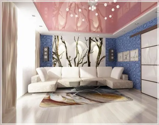 Палитра цветов натяжных потолков широка. Очень интересно и оригинально, когда натяжной потолок гармонирует с оттенком стен, а не повторяет его. Например, розовые обои и натяжные потолки цвета зелёного или салатного листочка выполненного в гипсокартоне выглядят очень красиво и необычно.
