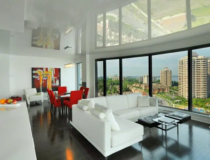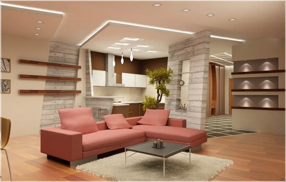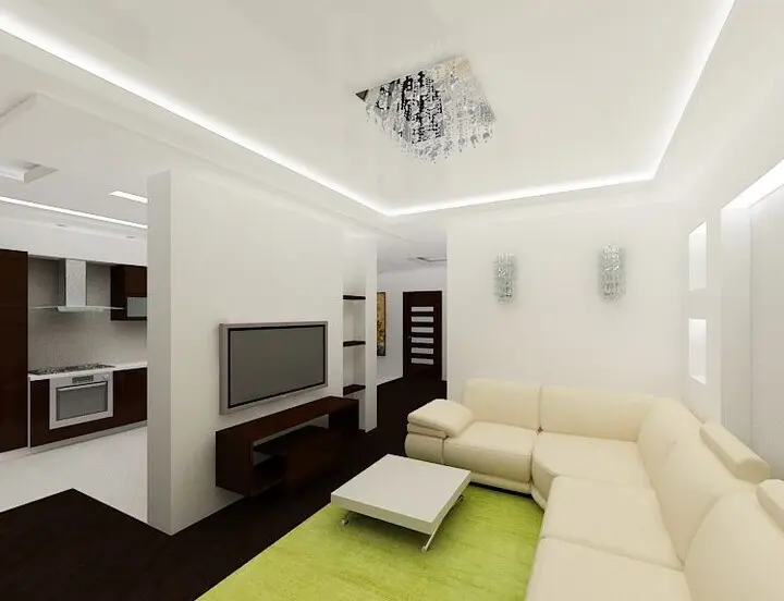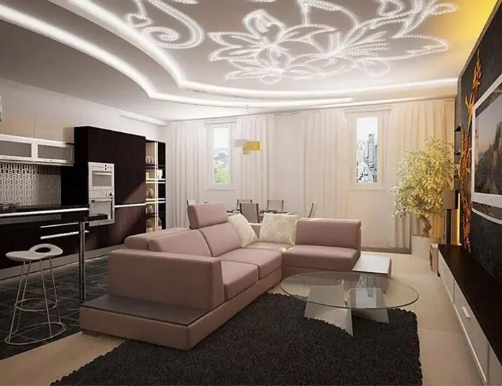 Хорошим дизайнерским решением, что придаёт этой функциональной зоне оригинальности, будет установка в ней современного прочного натяжного потолка. Натяжной потолок в гостиной создаст яркий эмоциональный фон и сделает интерьер более торжественным и светлым.