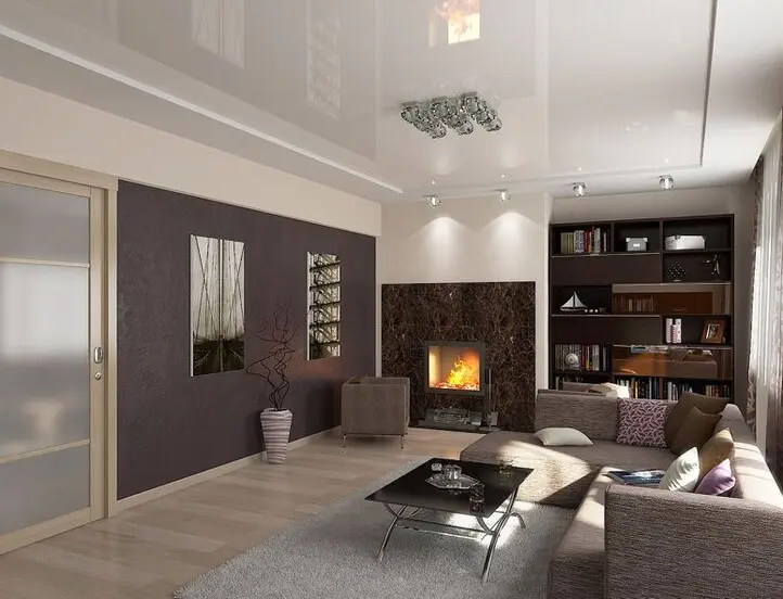Более того, удачным выбором могут стать натяжные потолки в гостиной яркого или тёмного цвета, такие как бордовый, фиолетовый или золотисто-коричневый. Можно подобрать материалы не одного цвета, а поиграть на контрасте.
