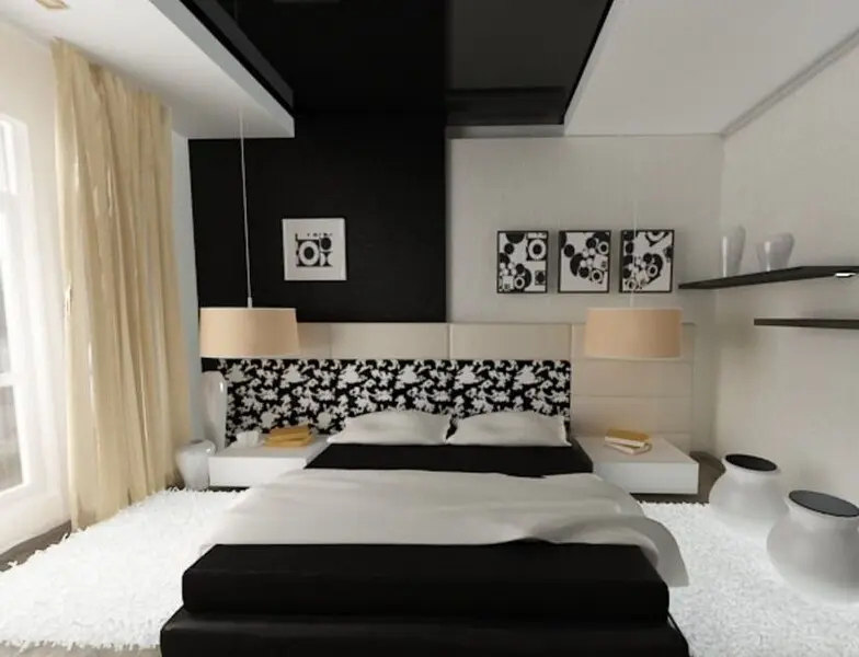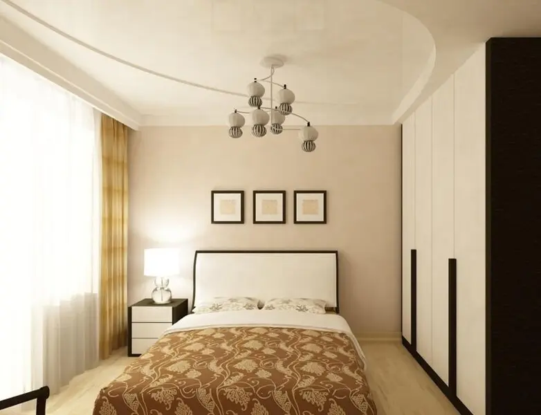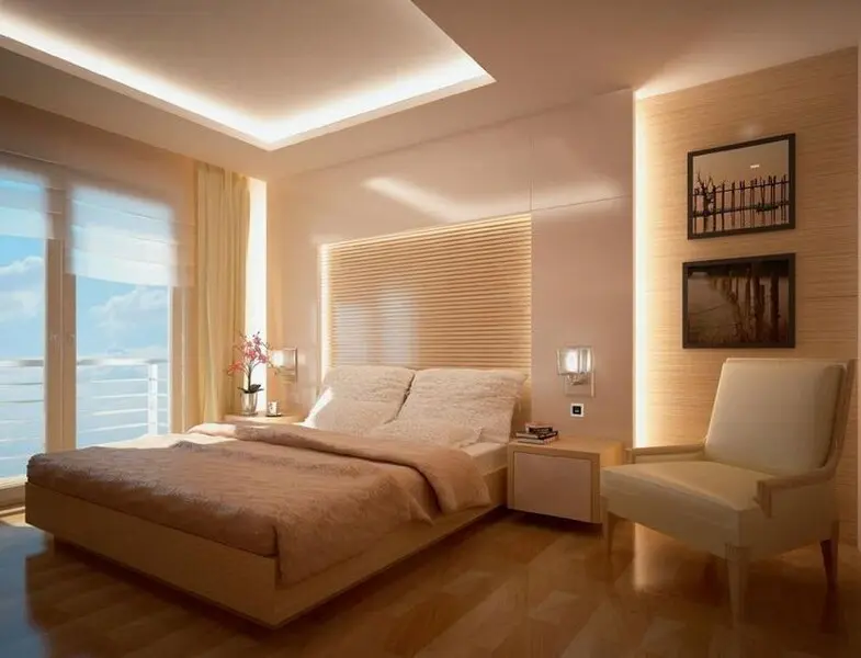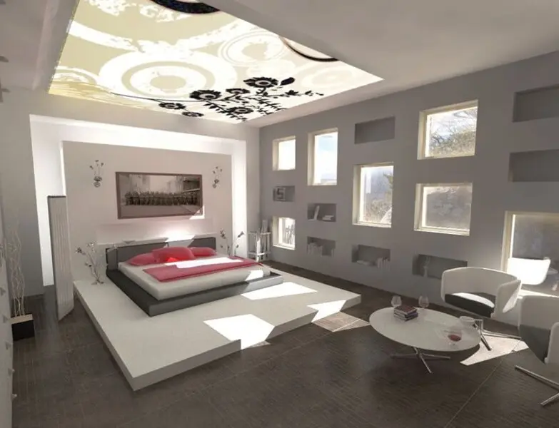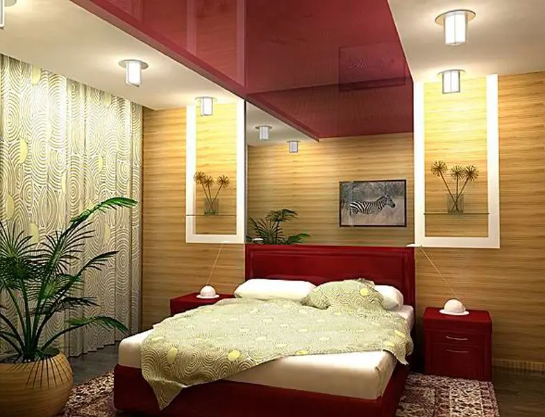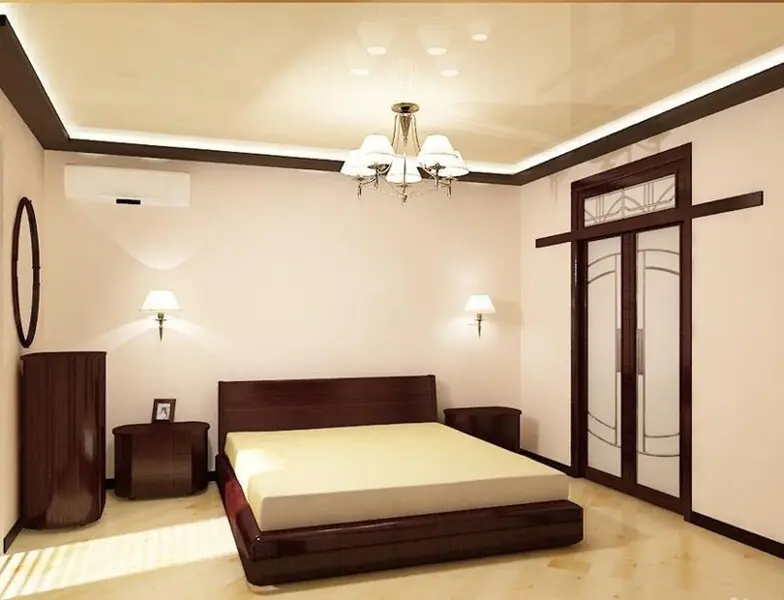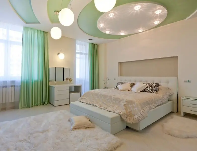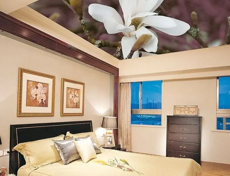 Важное значение имеет и потолок в спальне, а также его цвет и материал из которого он изготовлен.