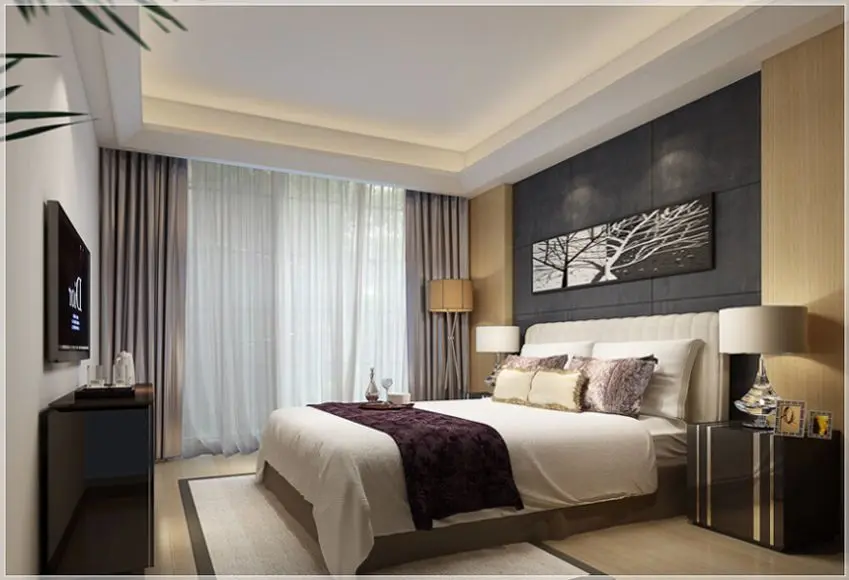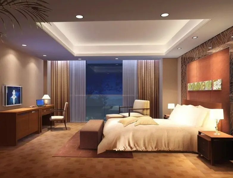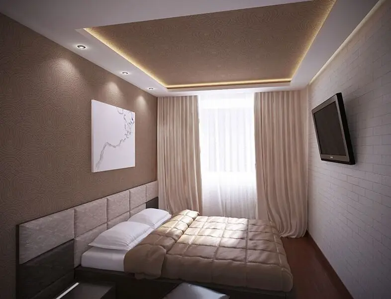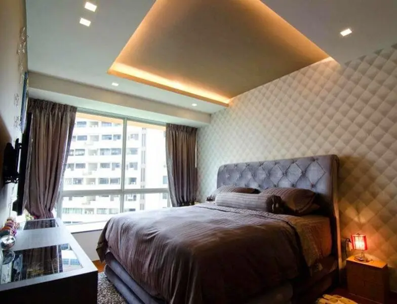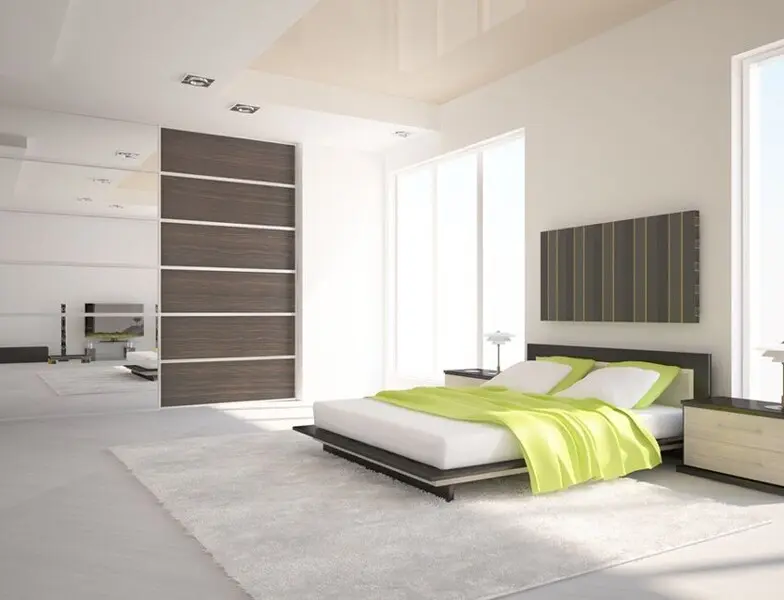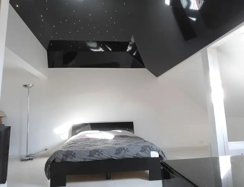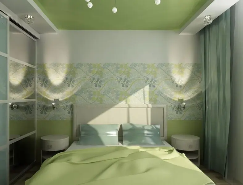 Важное значение имеет и потолок в спальне, а также его цвет и материал из которого он изготовлен.