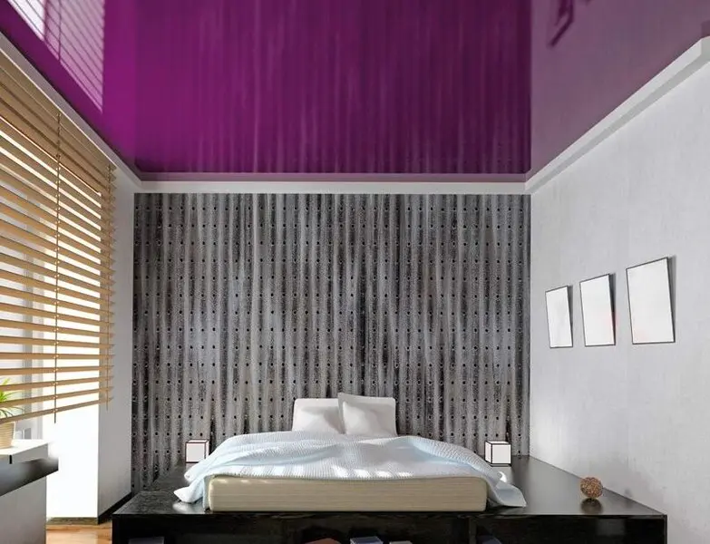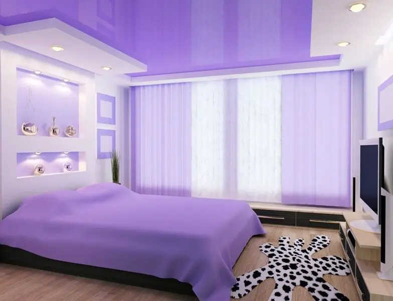 В наши дни идеальным решением является так называемый натяжной потолок в спальне.