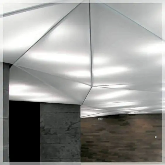 - Тканевые потолки обладают колоссальной прочностью, они прочнее потолков из ПВХ в 15-20 раз, поэтому из тканевых полотен монтируют не только потолки, но и натяжные стены.